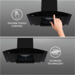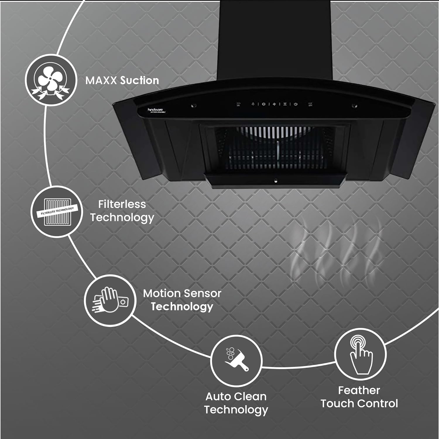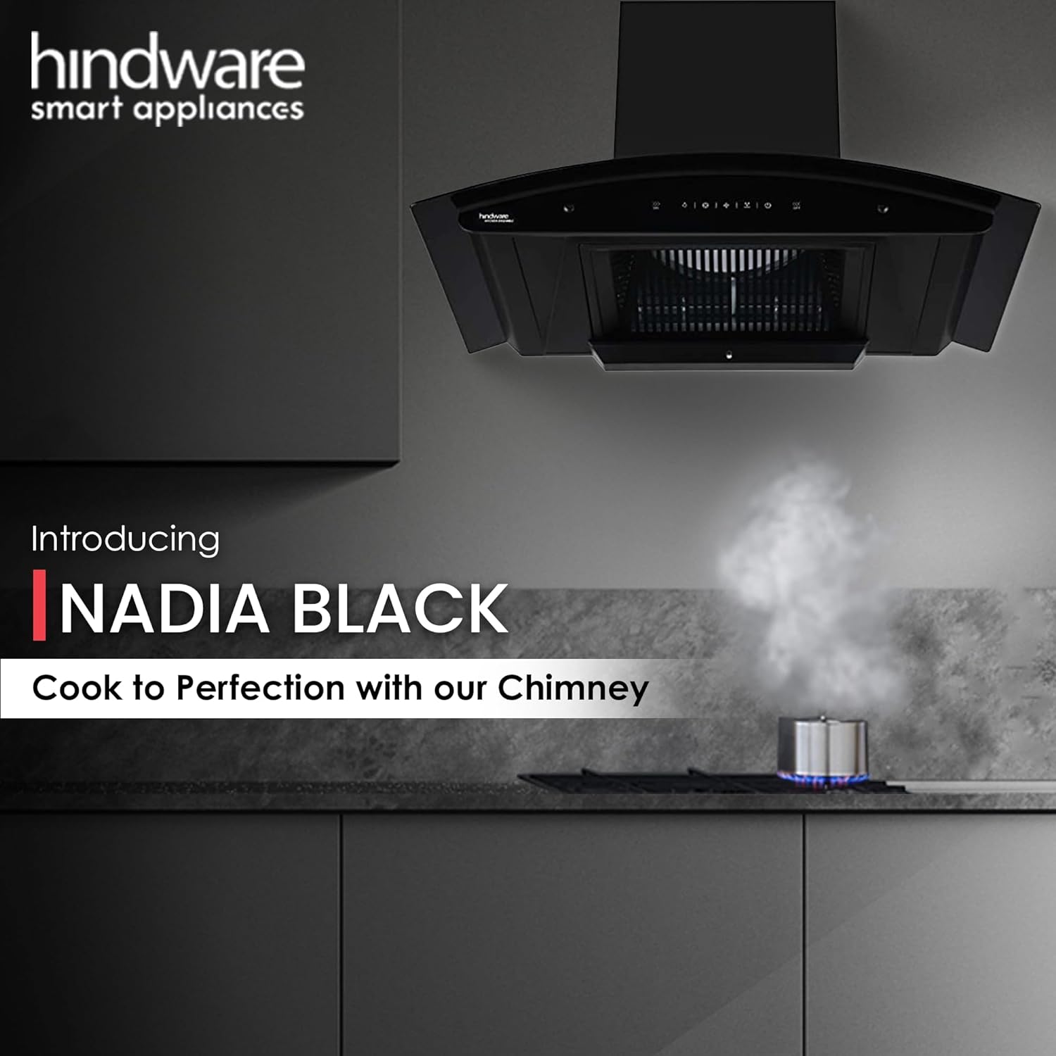 Hindware Smart Appliances | Nadia IN 90 cm Chimney | 1500 CMH |Curved Glass | Filterless | Auto Clean | Touch Control, Motion Sensor | 10 Yrs Warranty on Motor & 2 Yrs on Product (Black)